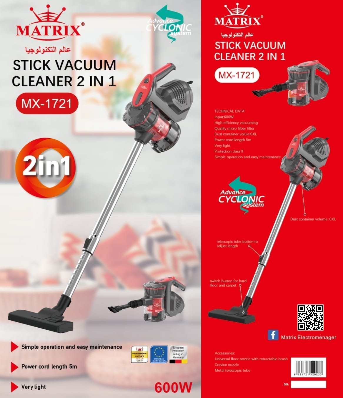 Aspirateur Balai 2en1 – 600W – 0.6L Noir et Rouge Matrix MX-1721